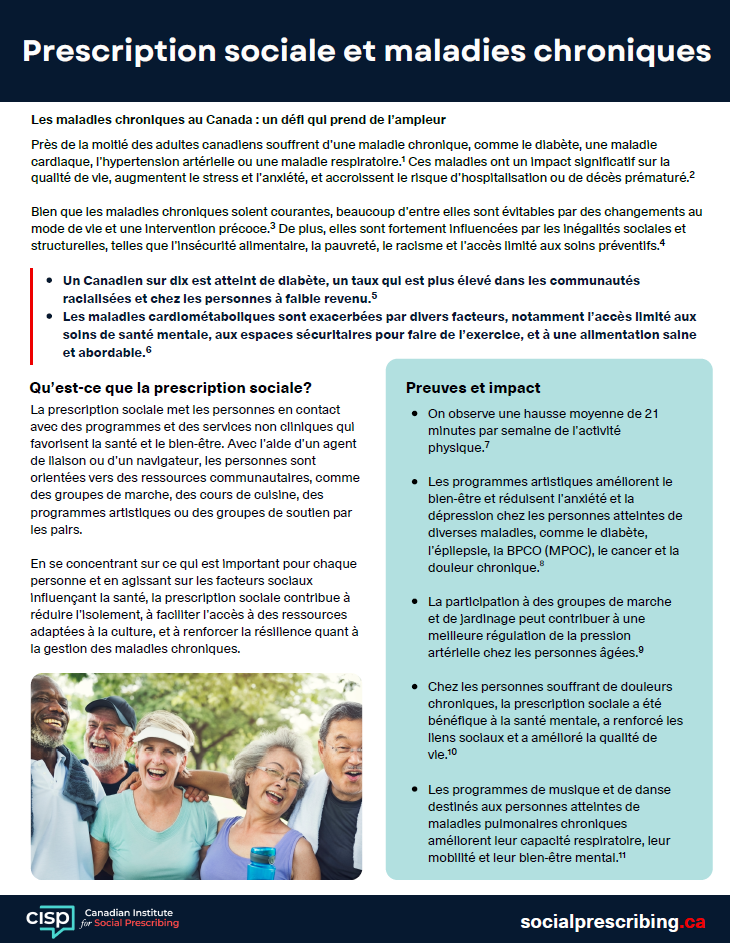 Cette série de fiches fondées sur des données probantes présente des informations concises et partageables sur les effets de la prescription sociale pour diverses populations. Ressources éducatives pour les prestataires de soins de santé, les décideurs, les chercheurs et le grand public, ces fiches d’information décrivent les principaux avantages et les statistiques essentielles, qu’il s’agisse du soutien au vieillissement à domicile, de la santé mentale des jeunes ou des retombées économiques et sociétales de la prescription sociale.
